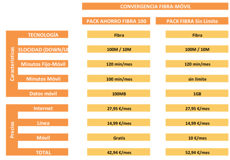 El pack ahorro sin limites por 10€ adicionales ofrece: Linea fija con TP fijos y 120min a móviles + ADSL 30MB + Móvil con llamadas ilimitadas y 1GB de internet